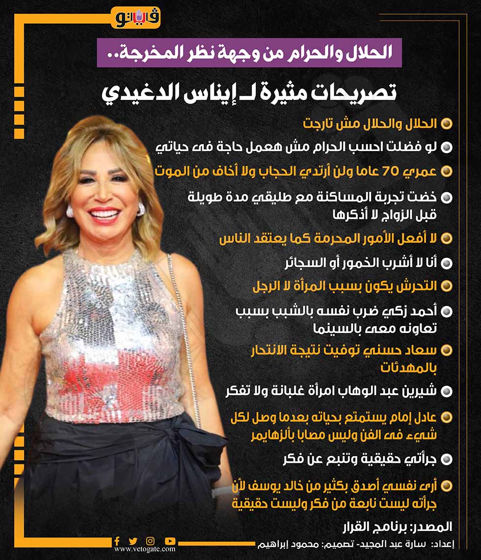 الحلال والحرام من وجهة نظر المخرجة.. تصريحات مثيرة لـ إيناس الدغيدي (إنفوجراف) السبت 31/أغسطس/2024 - 07:00 م 8/31/2024 7:00:39 PM إيناس الدغيدي، فيتو سارة عبد المجيد شارك طباعة 18 حجم الخط شارك طباعة المخرج خالد يوسف إيناس الدغيدي شيرين عبد الوهاب
