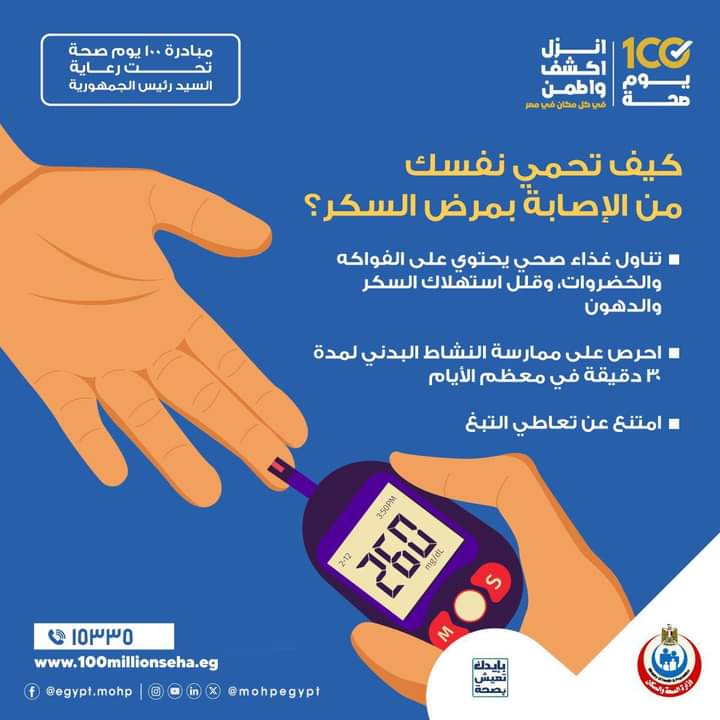 وجهت وزارة الصحة نصائح للحماية من الإصابة بمرض السكر خاصة وأنه من الأمراض المزمنة المصاحبة للمصاب به طوال حيات، ولا يتم الشفاء منه لذا يجب الالتزام بطرق الوقاية من مرض السكر.