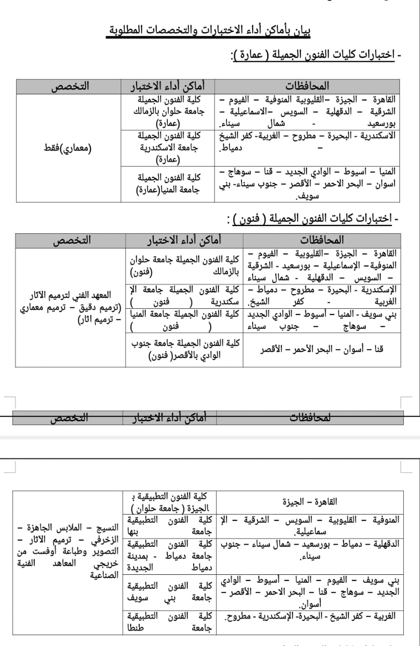 كليات الفنون الجميلة "عمارة – فنون" بجامعات( حلوان – الإسكندرية – المنيا – جنوب الوادي بالأقصر {فنون}فقط).
