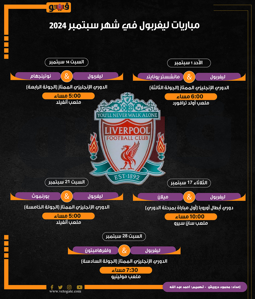 مباريات ليفربول في شهر سبتمبر 2024 (إنفوجراف) الأحد 01/سبتمبر/2024 - 01:00 م 9/1/2024 1:00:38 PM ليفربول محمود درويش شارك طباعة 18 حجم الخط شارك طباعة ليفربول الدوري الإنجليزي الممتاز دوري ابطال اوروبا ميلان مباريات ليفربول