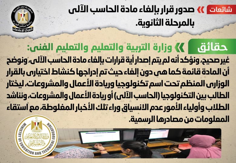 وتواصل المركز الإعلامي لمجلس الوزراء مع وزارة التربية والتعليم والتعليم الفني، والتي نفت تلك الأنباء، مُؤكدةً أنه لا صحة لإلغاء مادة الحاسب الآلي بالمرحلة الثانوية، وأنه لم يتم إصدار أية قرارات بإلغاء مادة الحاسب الآلي، موضحة أن المادة قائمة كما هي دون إلغاء حيث تم إدراجها كنشاط اختياري بالقرار الوزاري المنظم تحت اسم تكنولوجيا وريادة الأعمال والمشروعات، ليختار الطالب بين التكنولوجيا (الحاسب الآلي) أو ريادة الأعمال والمشروعات، مُناشدةً الطلاب وأولياء الأمور عدم الانسياق وراء تلك الأخبار المغلوطة، مع استقاء المعلومات من مصادرها الرسمية.