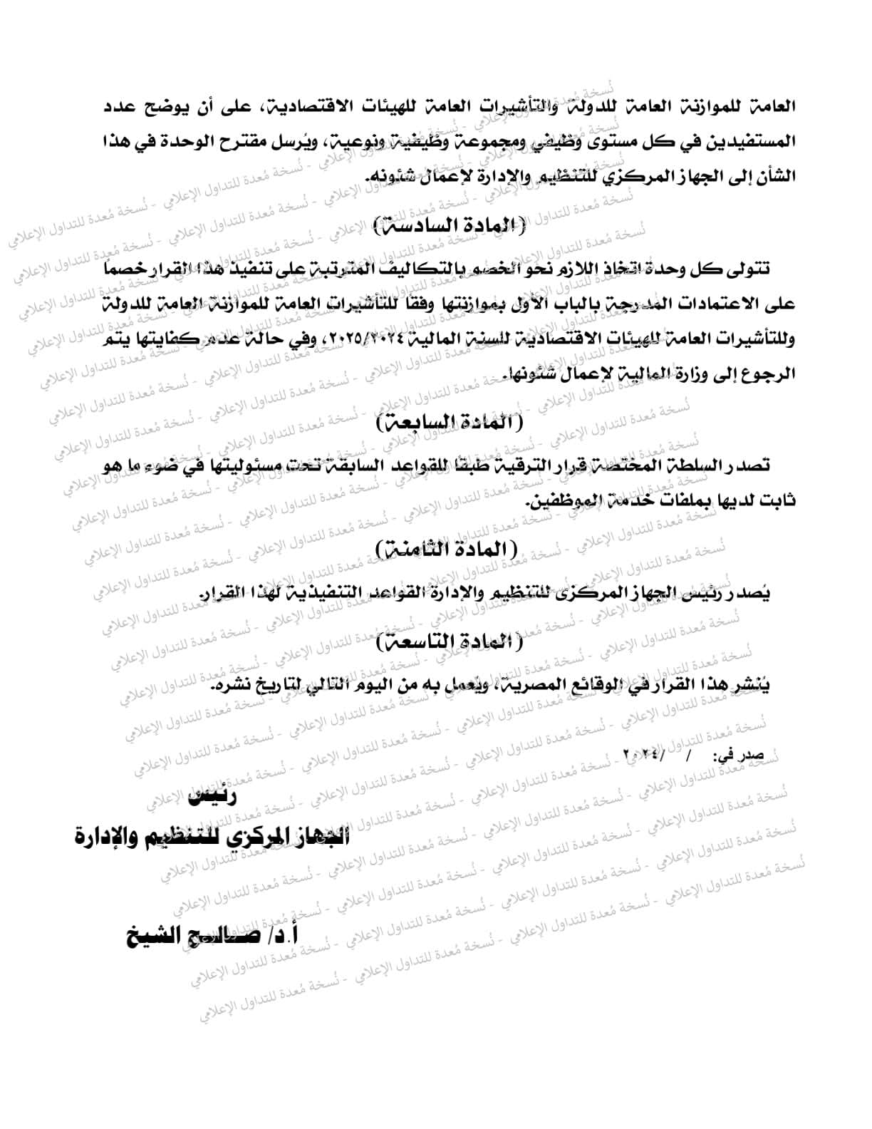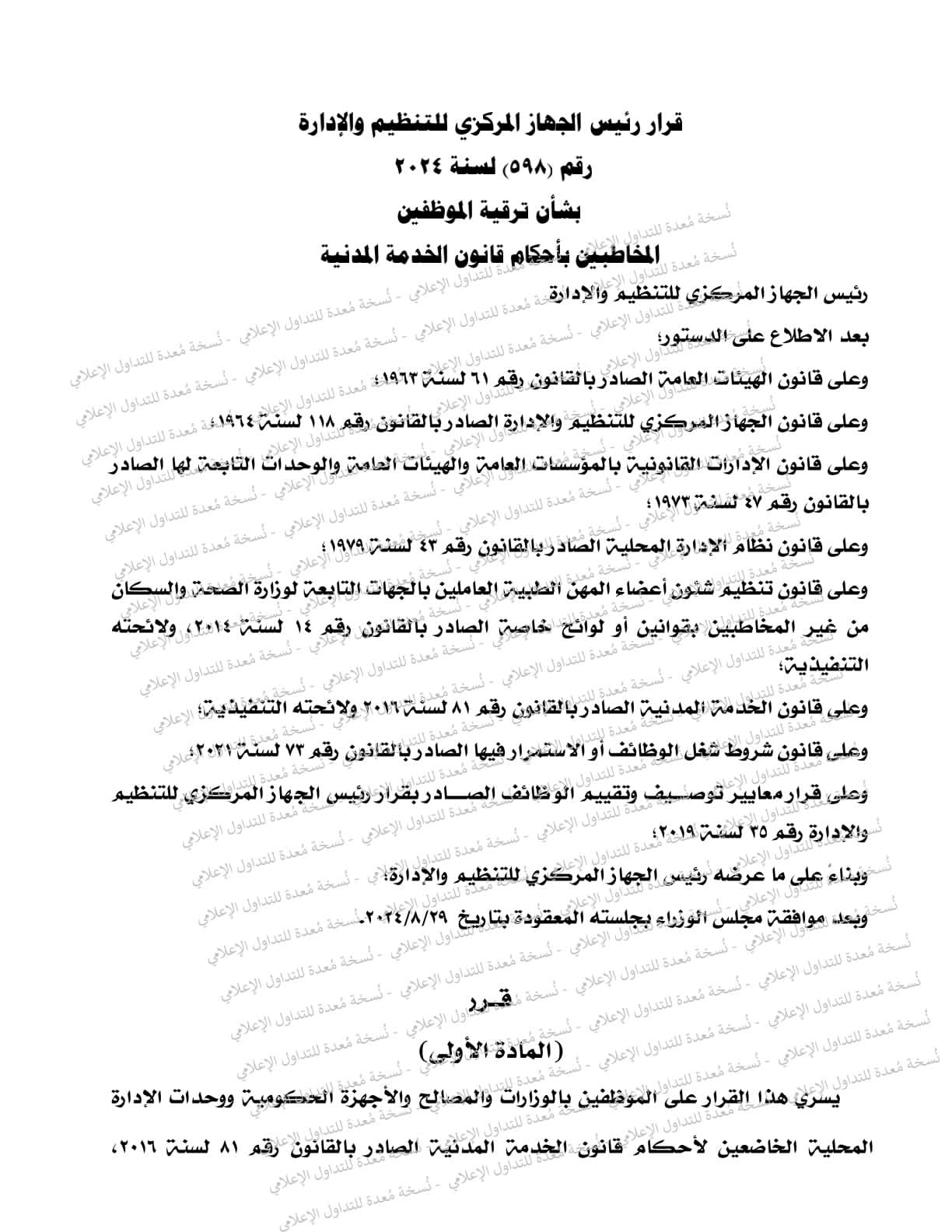 أصدر الدكتور صالح الشيخ، رئيس الجهاز المركزي للتنظيم والإدارة، قرارا رقم (٥٩٨) لسنة ٢٠٢٤ بترقية الموظفين بالجهاز الإداري للدولة.