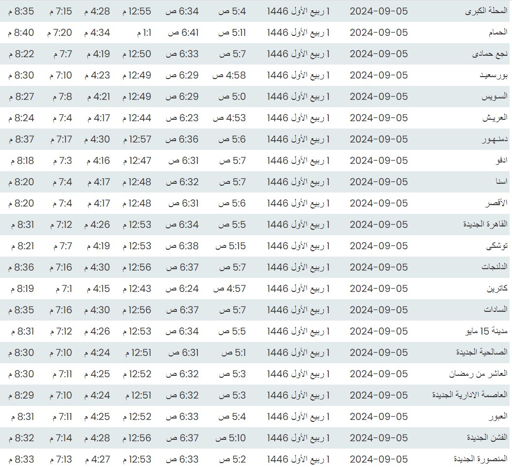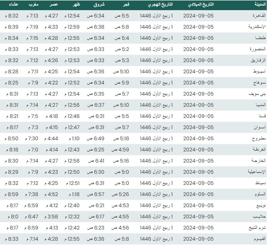 مواقيت الصلاة اليوم وفقًا للتوقيت المحلي لمدينتي القاهرة والإسكندرية وكذلك،مواقيت الصلاة، لعدد من مدن ومحافظات الجمهورية من واقع بيانات الهيئة العامة للمساحة