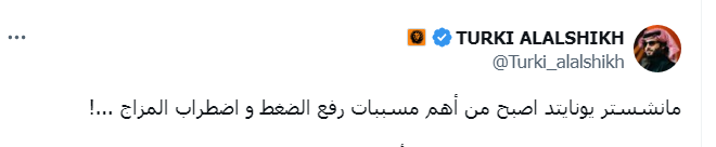وقال تركي آل الشيخ، في رسالته المؤلمة: نادي مانشستر يونايتد أصبح من أهم مسببات رفع الضغط، واضطراب المزاج.