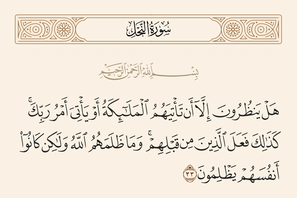قال تعالى: «هَلْ يَنْظُرُونَ إِلَّا أَنْ تَأْتِيَهُمُ الْمَلَائِكَةُ أَوْ يَأْتِيَ أَمْرُ رَبِّكَ كَذَلِكَ فَعَلَ الَّذِينَ مِنْ قَبْلِهِمْ وَمَا ظَلَمَهُمُ اللَّهُ وَلَكِنْ كَانُوا أَنْفُسَهُمْ يَظْلِمُونَ».