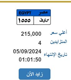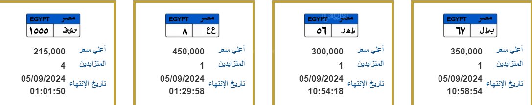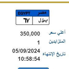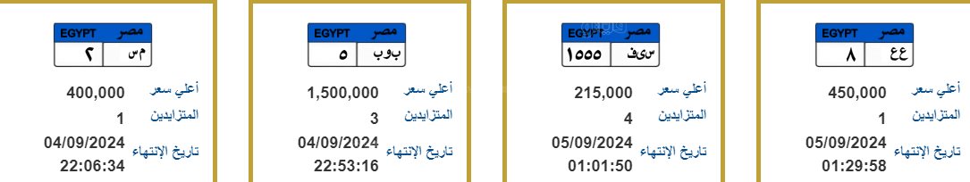 كما طرحت وزارة الداخلية اللوحة المعدنية "م س 2" بسعر 400 ألف جنيه، لوحة معدنية "ب ط ل 67" بسعر 350 ألف جنيه، لوحة "ط ه ر 56" بسعر 300 ألف جنيه،/ "ع ع 8" بسعر 450 ألف جنيه، "س ي ف 1555" بسعر 215 ألف جنيه.