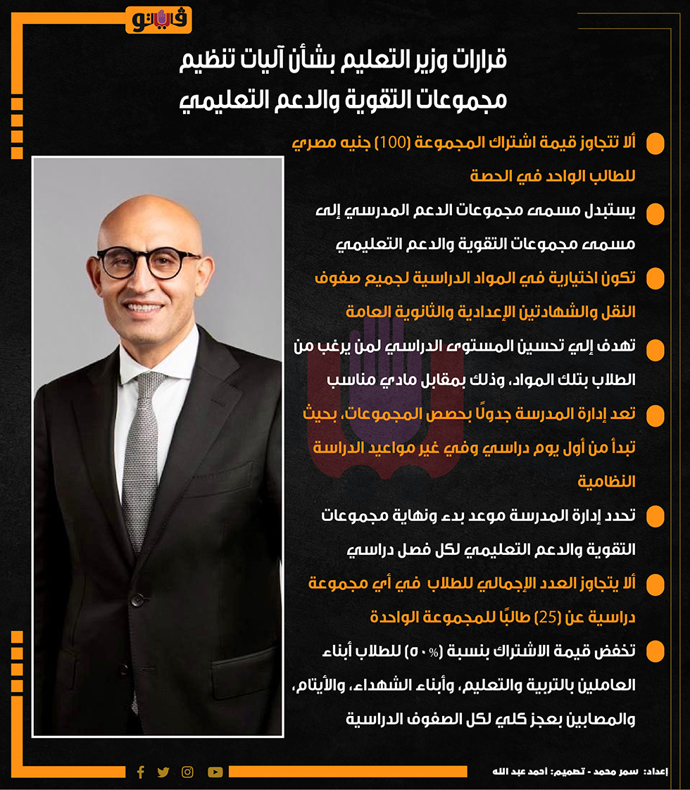 قرارات وزير التعليم بشأن آليات تنظيم مجموعات التقوية والدعم التعليمي (انفوجراف) الإثنين 02/سبتمبر/2024 - 09:58 م 9/2/2024 9:58:47 PM وزارة التربية والتعليم سمر محمد شارك طباعة 18 حجم الخط شارك طباعة الثانوية العامة الشهادتين الاعدادية والثانوية مجموعات التقوية مجموعات الدعم المدرسي مجموعات الدعم وزير التعليم