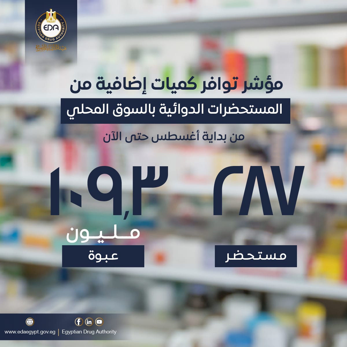 يأتى في إطار حرص الحكومة على متابعة سوق الدواء، واستمرار جهود هيئة الدواء المصرية لضمان توافر الأدوية الضرورية في السوق المحلي؛ تم ضخ كميات إضافية من العديد من المستحضرات الدوائية المهمة أبرزهم أدوية الضغط والقلب والسكر والأورام والمضادات الحيوية.