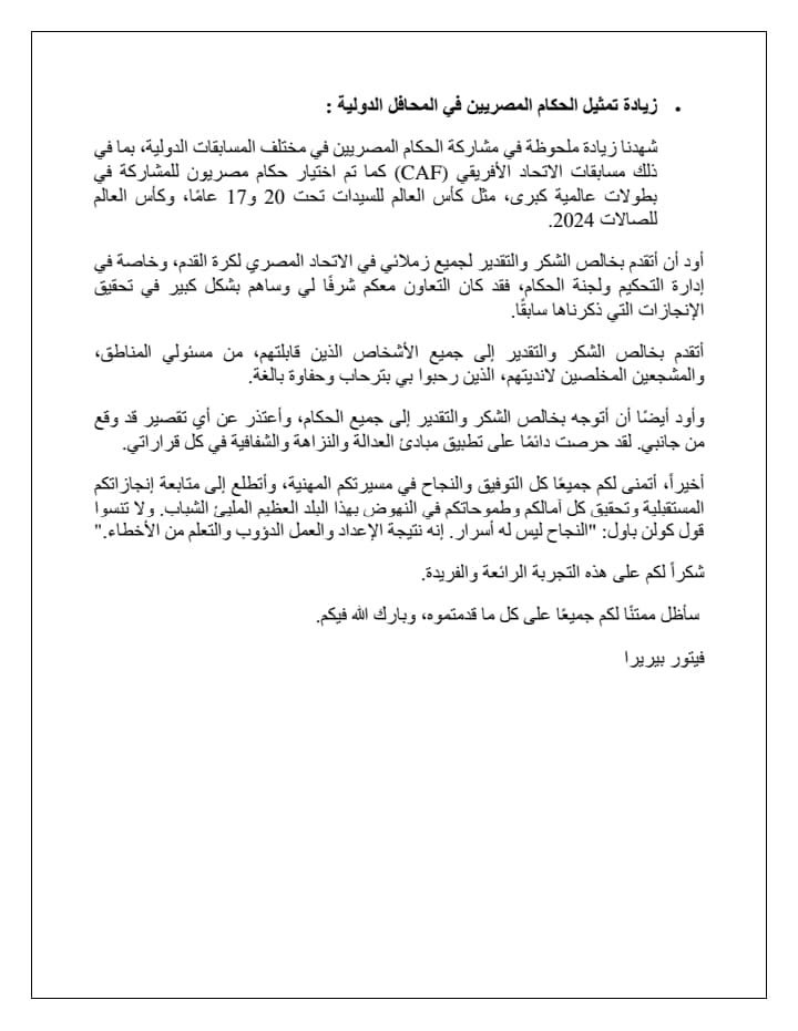 وجه البرتغالي فيتور بيريرا رئيس لجنة الحكام الرئيسية بالاتحاد المصري لكرة القدم السابق، رسالته لمنظومة التحكيم المصري والحكام المصريين وجميع أسرة الرياضة المصرية حول تجربته في رئاسة لجنة الحكام.