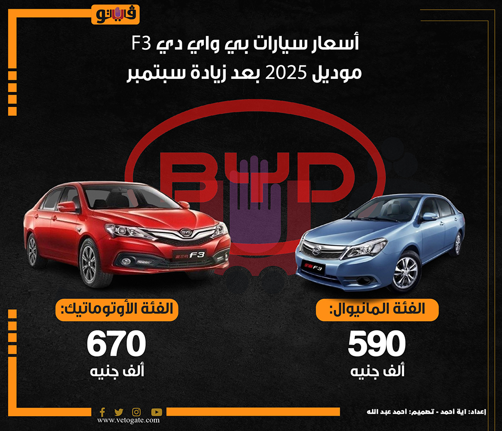 أسعار سيارات بي واي دي F3 موديل 2025 بعد زيادة سبتمبر 2024 (انفوجراف) الخميس 05/سبتمبر/2024 - 11:00 ص 9/5/2024 11:00:33 AM سيارات آية أحمد شارك طباعة 18 حجم الخط شارك طباعة سيارات بي واي دي سيارات سعار سيارات الاوتوماتيك