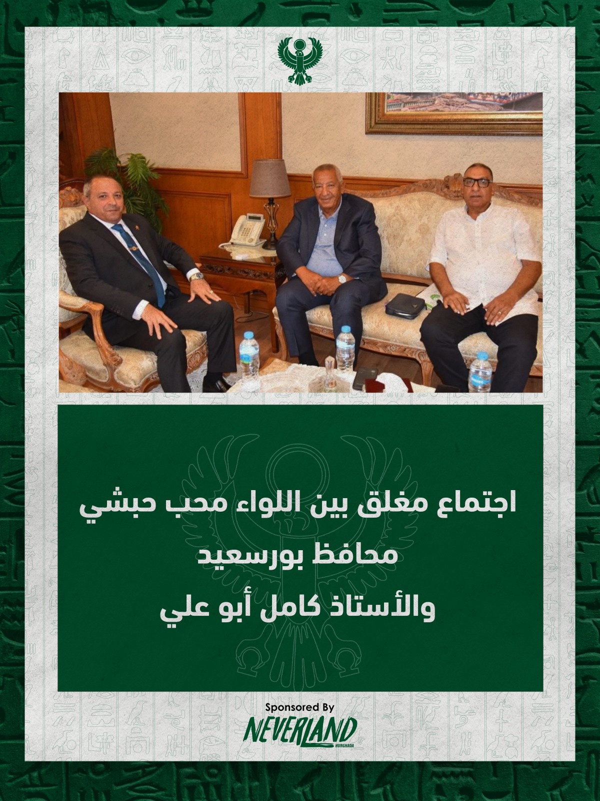 وبمقر ديوان عام محافظة بورسعيد، عقد اللواء أركان حرب، محب حبشي محافظ بورسعيد اجتماعًا مغلقًا مع كامل أبو علي رئيس مجلس إدارة النادي المصري وذلك بحضور رجب عبد القادر نائب رئيس مجلس إدارة المصري.