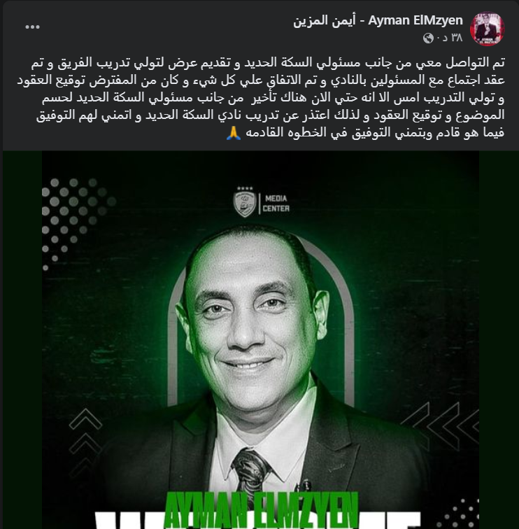 وقال أيمن المزين عبر صفحته: "تم التواصل معي من جانب مسئولي السكة الحديد وتقديم عرض لتولي تدريب الفريق وتم عقد اجتماع مع المسئولين بالنادي وتم الاتفاق على كل شيء وكان من المفترض توقيع العقود وتولي التدريب أمس إلا أنه حتى الآن هناك تأخير من جانب مسئولي السكة الحديد لحسم الموضوع وتوقيع العقود".