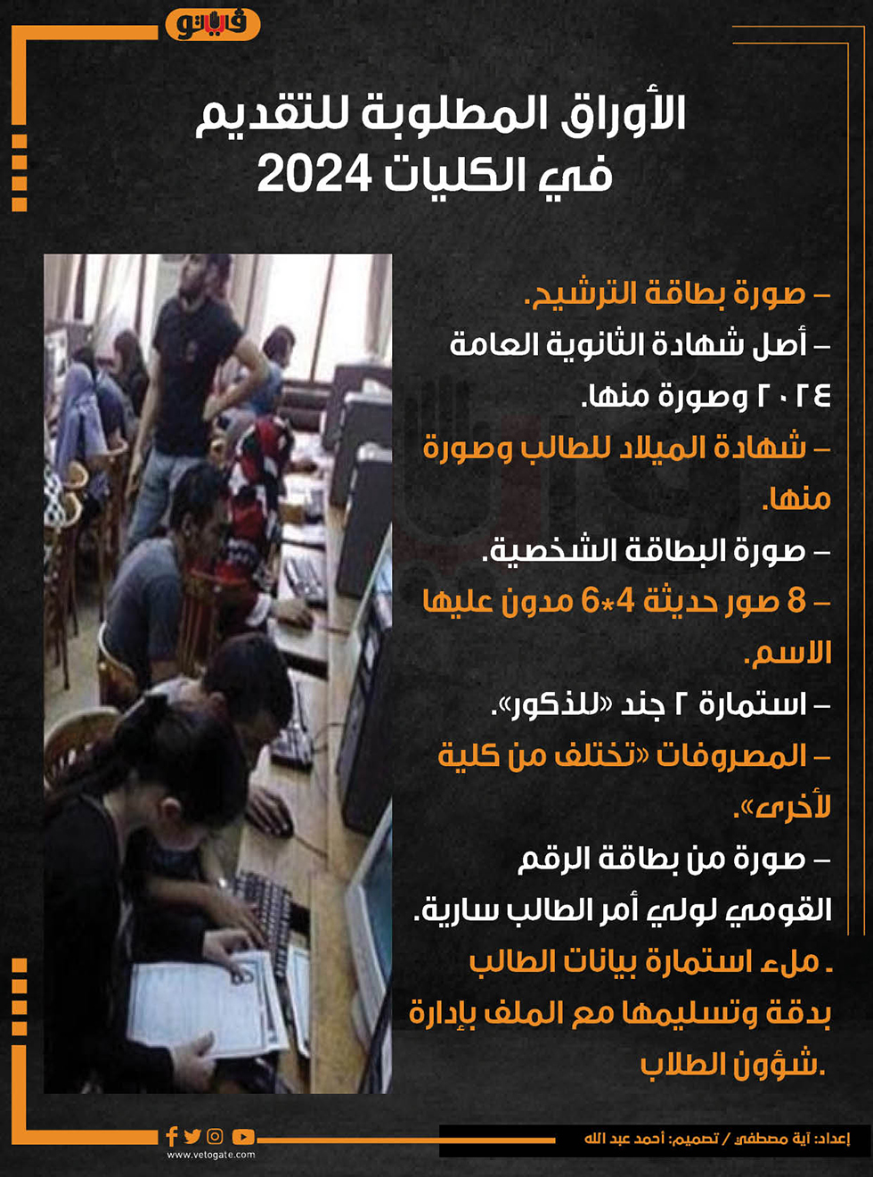الأوراق المطلوبة للتقديم في الكليات 2024 (إنفوجراف) الأربعاء 04/سبتمبر/2024 - 10:04 ص 9/4/2024 10:04:22 AM تنسيق الكليات، فيتو آية مصطفى شارك طباعة 18 حجم الخط شارك طباعة الثانوية العامة 2024 البطاقة الشخصية شهادة الثانوية العامة 2024 شهادة الثانوية العامة صورة البطاقة شهادة الميلاد