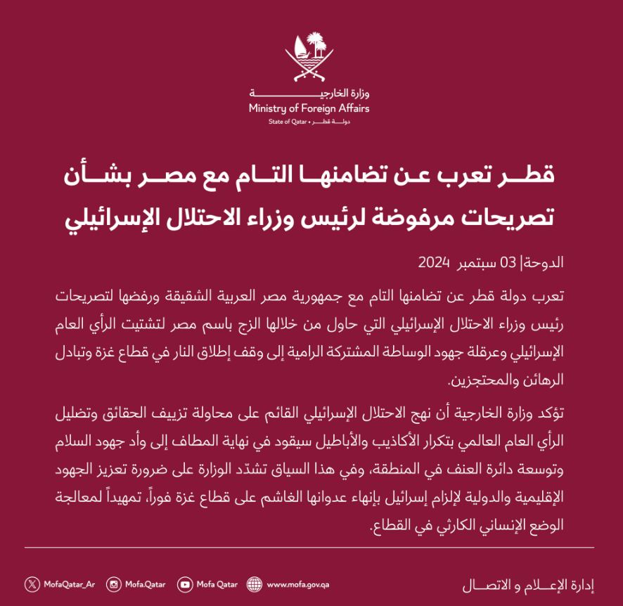 أكدت وزارة الخارجية القطرية تضامنها الكامل مع مصر ورفضها زج رئيس الوزراء الإسرائيلي بنيامين نتنياهو الزج باسمها لتشتيت الرأي العام الإسرائيلي وعرقلة جهود الوساطة المشتركة الرامية إلى وقف إطلاق النار في قطاع غزة وتبادل الرهائن والمحتجزين.