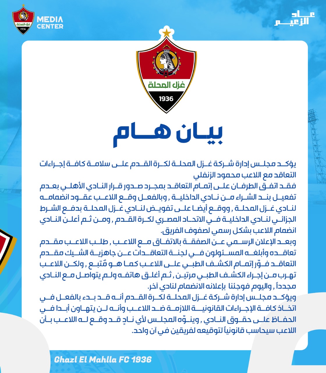 يؤكد مجلس إدارة شركة غزل المحلة لكرة القدم على سلامة كافة إجراءات التعاقد مع اللاعب محمود الزنفلي.