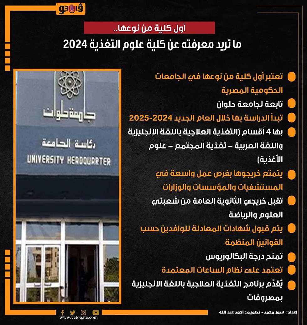 واستكمالا للخدمات التي تحرص بوابة فيتو علي تقديمها لطلاب الثانوية العامة وأولياء الأمور ننشر خلال السطور التالية كافة التفاصيل عن تنسيق كلية علوم التغذية جامعة حلوان 2024.