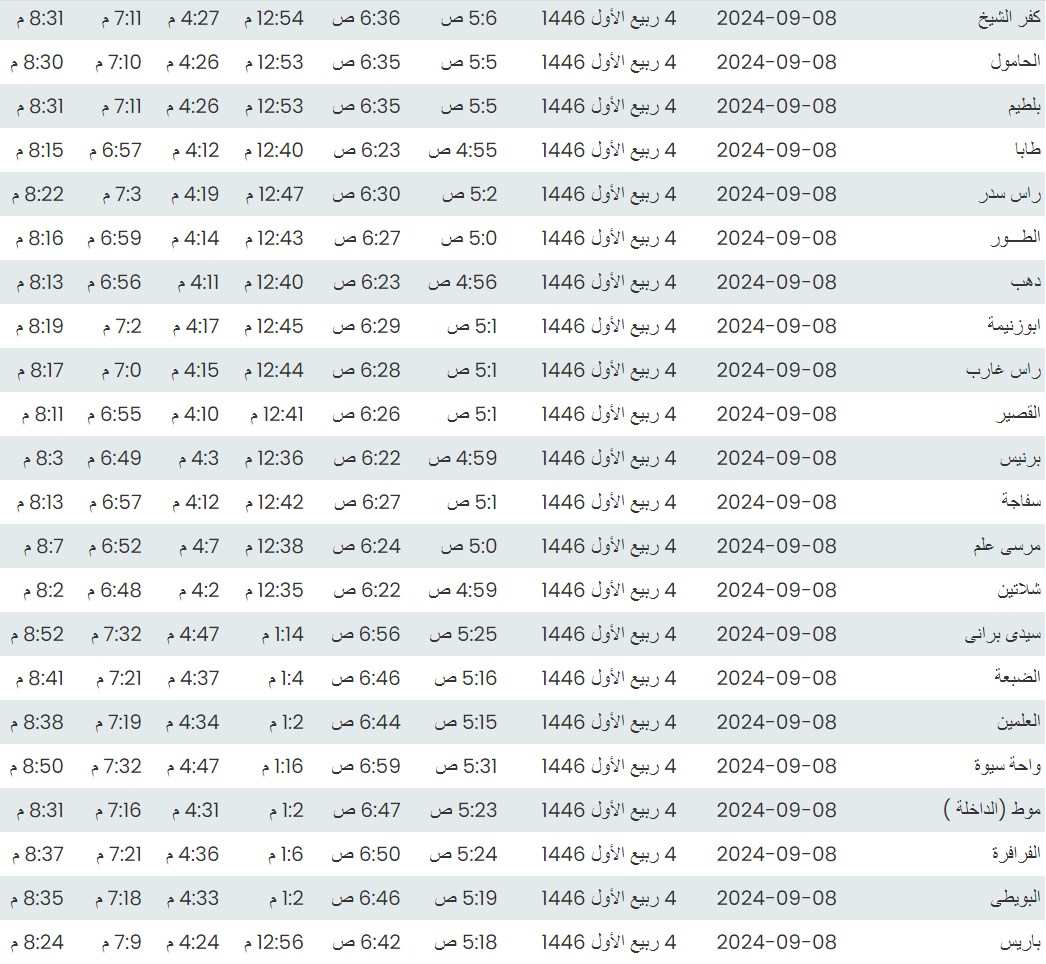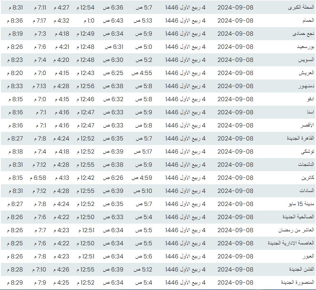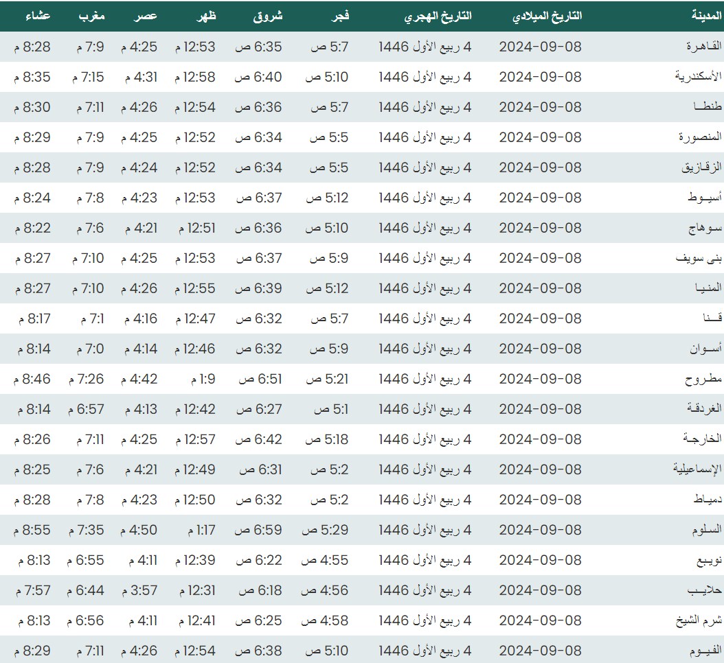 وفيما يلي مواقيت الصلاة، لعدد من مدن ومحافظات الجمهورية من واقع بيانات الهيئة العامة للمساحة