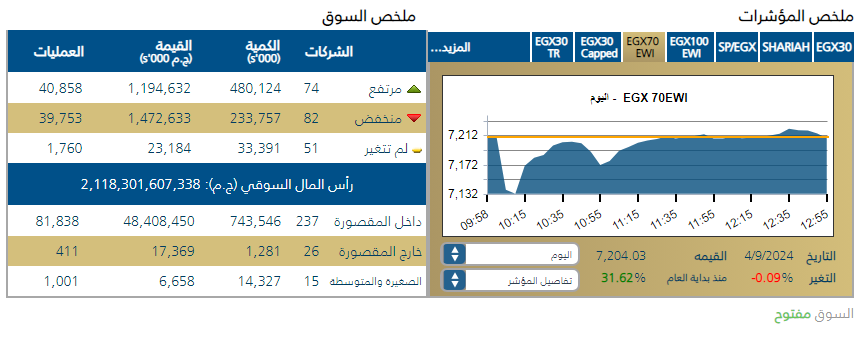 - وصعد مؤشر الشركات الصغيرة والمتوسطة "إيجي إكس 70 متساوي الأوزان" بنسبة 0.09 % عند مستوى 7.204.03 نقطة.