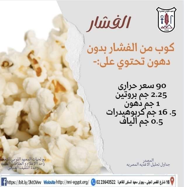 كشف المعهد القومي للتغذية عن البديل الصحي للمقرمشات وهو الفشار حيث يعتبر من التسالي المفيدة وليس لها أي أضرار صحية.