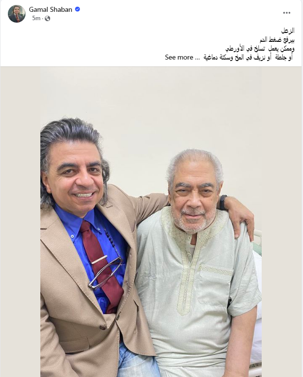 كما أكد الدكتور جمال شعبان أن السر في الحالة الصحية التي يعانيها الفنان صبري عبد المنعم تكمن في "الزعل"، مشيرًا إلى أن الزعل يرفع ضغط الدم ويمكن أن يؤدي لنزيف في المخ وسكتة دماغية، ويسبب ذبحة صدرية قد تنتهي بسكتة قلبية، ويسبب أورام القولون أيضًا.