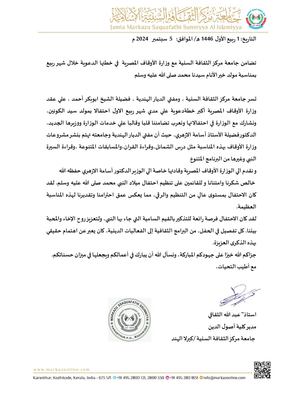أعلنت جامعة مركز الثقافة السنية الإسلامية بالهند تضامنها مع مبادرة وزارة الأوقاف المصرية (خُلُقٌ عَظِيمٌ)، بمناسبة مولد خير الأنام نبينا محمد (صلى الله عليه وسلم) خلال شهر ربيع الأول.