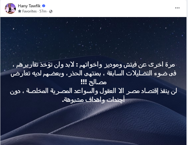 وقال الخبير الاقتصادي هاني توفيق عن تقارير المؤسسات الدولية عن الاقتصاد المصري: "مرة أخرى عن فيتش وموديز وأخواتهم: لابد وأن تؤخذ تقاريرهم، فى ضوء التضليلات السابقة، بمنتهى الحذر، وبعضهم لديه تعارض مصالح!".
