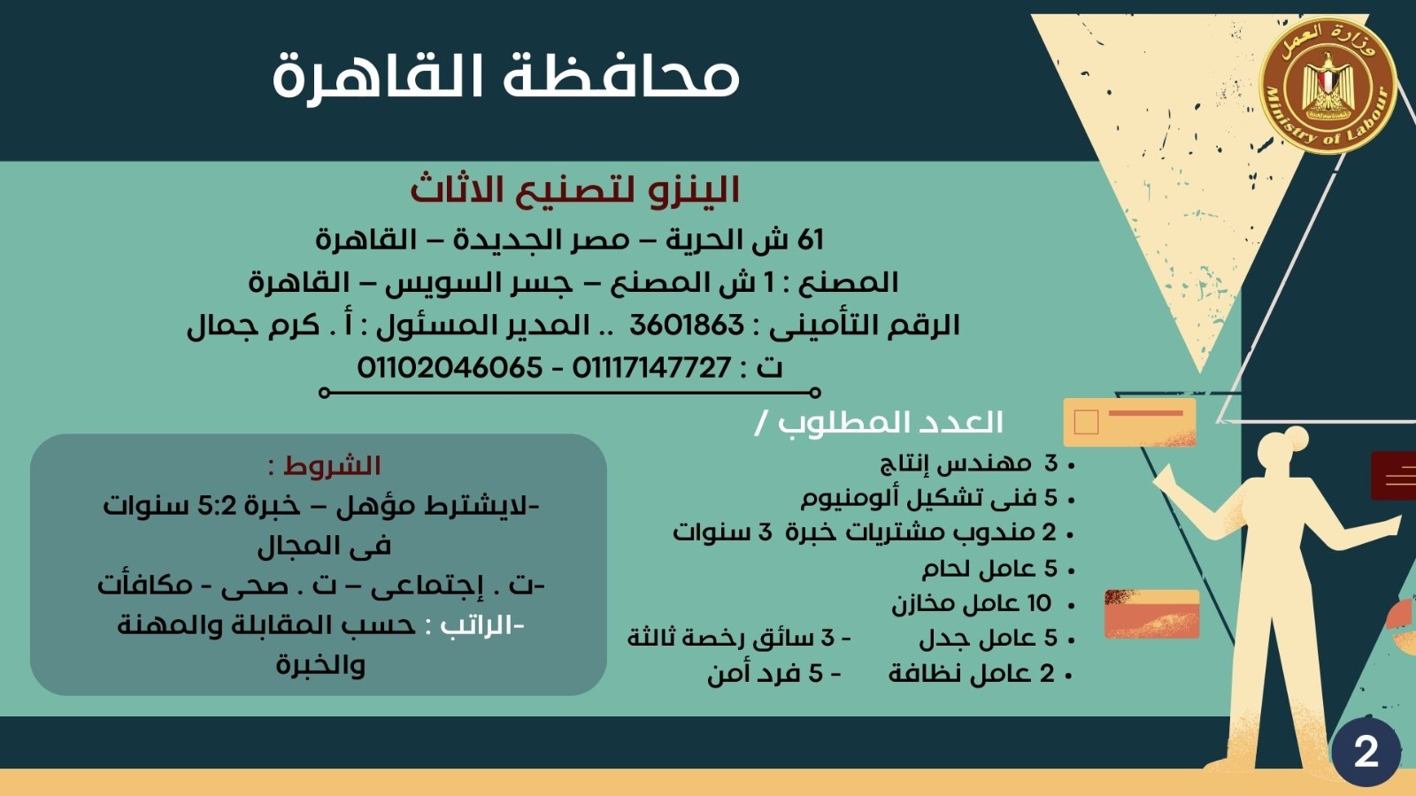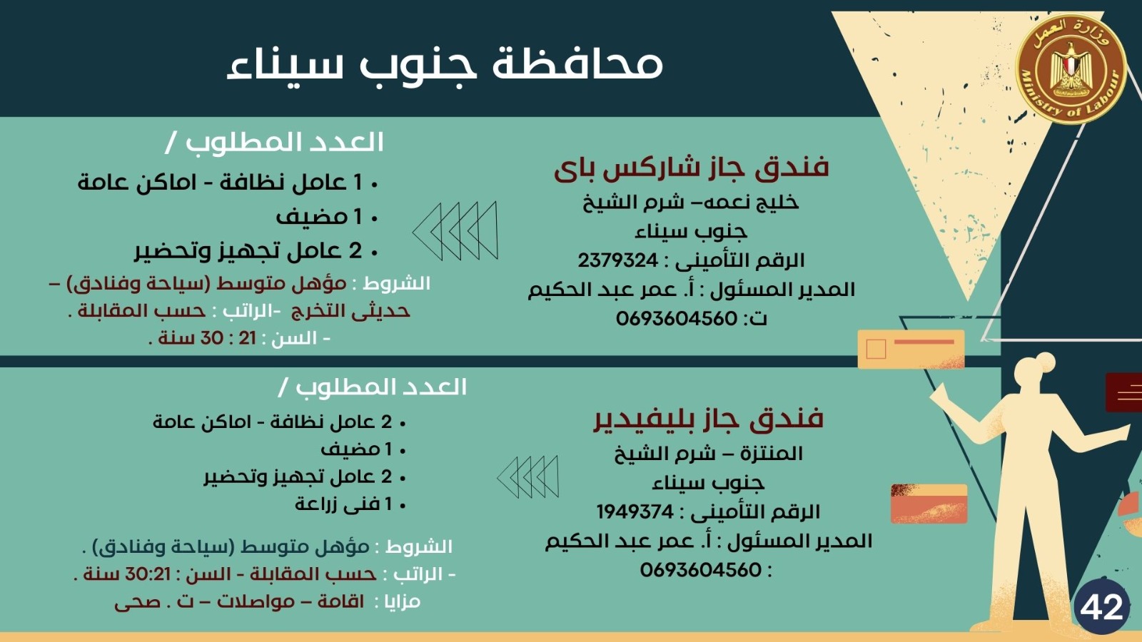 وبحسب البيان قالت "الوزارة" أن نشرة التوظيف الدورية تَصّدُر كل 15 يومًا، من خلال الإدارة العامة للتشغيل برئاسة هبه أحمد مدير عام التشغيل بالوزارة، وإعداد منى شوقي باحث أول بـ"الإدارة"، تُعلِن اليوم عن فُرص عمل جديدة،مُتوفرة في 15 محافظة،هي: القاهرة، والجيزة، والقليوبية،والشرقية،والأسكندرية، وبورسعيد،وسوهاج، وأسيوط، ودمياط، والغربية، والدقهلية، والمنوفية، وكفر الشيخ،والوادى الجديد، وجنوب سيناء..وفي تخصصات: مسئول إئتمان،وصيدليين، ومساعد صيدليين،ومحاسبين، ومعلمين قيادة، ومحصل، وموظفين استقبال فرع، وبائعين، وتلى سيلز، وخدمة عملاء، وأخصائي جودة بكالريوس زراعة، ومدير إنتاج، ومشرف خطوط إنتاج، واخصائى تمويل،وأمين مخازن، ومهندسين ميكانيكا، وإنتاج وجودة، ومدرسين علوم ورياضيات ولغة صينية وإنجليزية، وحاسب آلي،وزائرة صحية،ومشرف أتوبيس، واخصائى سلامة وصحة مهنية،ومحضر أدوية، ودليفرى، ومحاسب خزينة، وسكرتارية، وأعمال إدارية، وسائقين رخصة أولى وثانية وثالثة، ومندوبين مبيعات،ومراقبين جودة،وفنيين جميع التخصصات، ومشرفي إنتاج، وأفراد أمن، وعمال خياطة بكافة الأقسام،وعمال انتاج، وعمال نظافة، وكافة تخصصات الفندقة، وتخصصات أخرى.