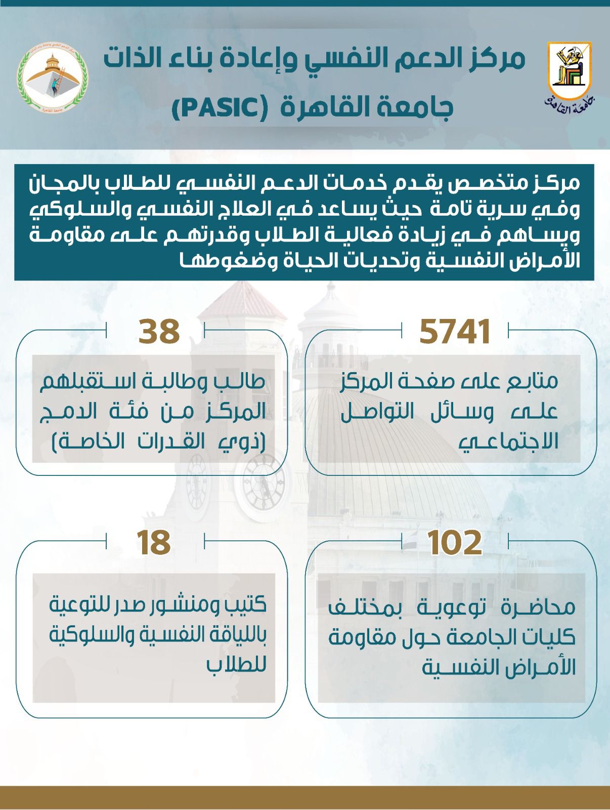 جدير بالذكر أن مركز الدعم النفسي وإعادة بناء الذات بجامعة القاهرة، أصدر في وقت سابق دليلًا للدعم والإرشاد النفسي لطلاب الفرق النهائية، بهدف تقديم المساندة النفسية لهم خلال فترة الامتحانات، ومحاولة لدعمهم في ظل ضغوط الامتحانات، حيث تضمن الدليل إرشادات نفسية وتدريبات للتخلص من التحيزات والأفكار السلبية الناجمة عن المخاوف والقلق وتعديلها إلى أفكار إيجابية، وإرشادات لخفض قلق الامتحانات، والاستذكار الفعال والاستعداد للاختبارات الموضوعية، وإرشادات وتدريبات لتنمية مهارات تنظيم الانفعالات، والمرونة في التفكير.