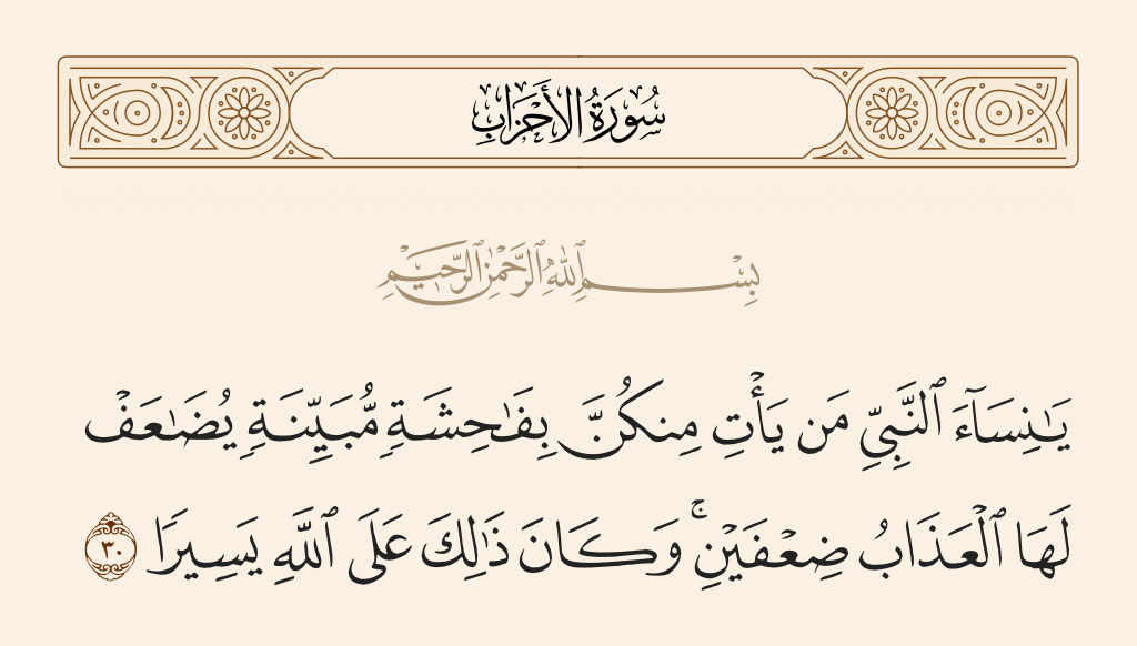 قال تعالى: «يا نِساءَ النَّبِيِّ مَنْ يَأْتِ مِنْكُنَّ بِفاحِشَةٍ مُبَيِّنَةٍ يُضاعَفْ لَهَا الْعَذابُ ضِعْفَيْنِ وَكانَ ذلِكَ عَلَى اللَّهِ يَسِيرًا».
