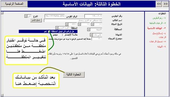 ( منطقة القاهرة أو منطقة الوجه البحري) وعند دخولك إلي شاشة البيانات الأساسية سيجد أنه مفتوح لك التقديم في منطقة الوجه البحري كمنطقة رئيسية فإذا أردت تقديم رغباتك في هذه المنطقة اضغط علي الخطوة التالية أما إذا أردت تغيير المنطقة وتقديم رغباتك في منطقة القاهرة فانك ستجد أسفل الجزء الخاص باسم المنطقة عبارة.