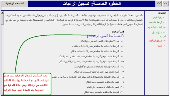 بعد الضغط على الخطوة التالية في الشاشة رقم (5) ستظهر لك قائمة بالرغبات التي أدخلتها لتتأكد منها كما في الشاشة التالية شاشة (6) - فإذا أردت التعديل في أي رغبة منها قم بالضغط على رابط "اضغط هنا لتعديل الرغبات" والشاشة (6) نظرا لطولها فقد تم تقسيمها علي صورتين).
