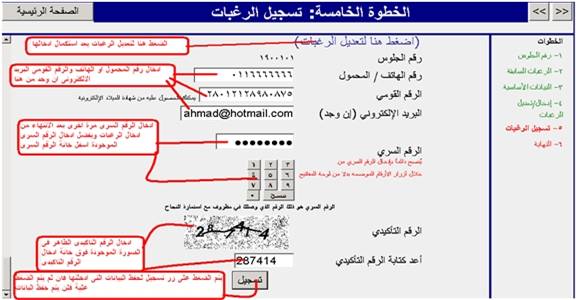 بعد ان تأكدت من رغباتك فستجد في آخر الشاشة - شاشة (6) جزء (ب) - حقول لإدخال رقم الهاتف - والرقم القومي - والبريد الإلكتروني (إن وجد) ثم إدخال الرقم السري مرة أخرى وإعادة ادخال الرقم التأكيدي كما هو موضح في الصورة وبعد ذلك يتم الضغط على زر "التسجيل" وذلك لحفظ كل بياناتك ورغباتك.