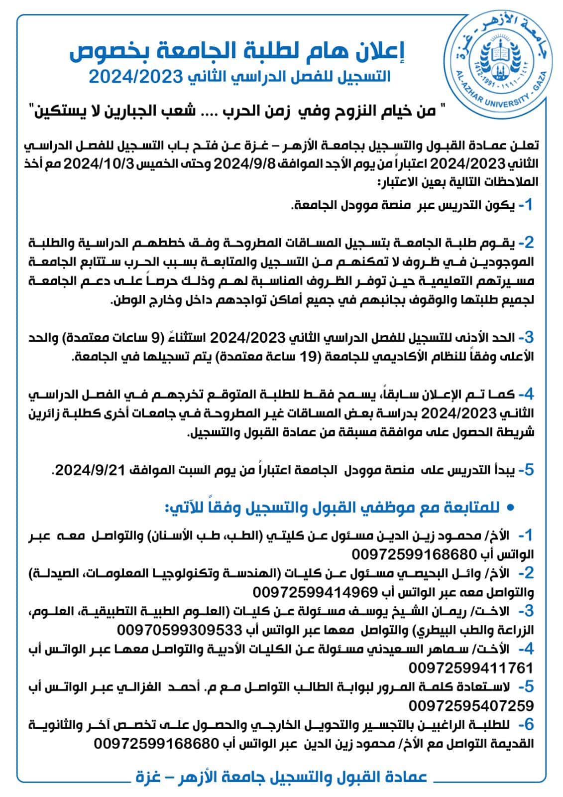 أعلنت عمادة القبول والتسجيل بـ"جامعة الأزهر - غزة" عن فتح باب التسجيل للفصل الدراسي الثاني 2023/2024 اعتبارًا من غد الأحد الموافق 8/9/2024 وحتى الخميس 3/10/2024، مع أخذ الملاحظات التالية بعين الاعتبار: