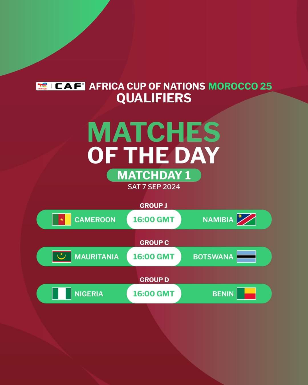 وتختتم الجولة الأولى بثلاثة مباريات قوية هي الكاميرون ضد ناميبيا ونيجيريا ضد بنين، وموريتانيا ضد بوتسوانا في مجموعة مصر.