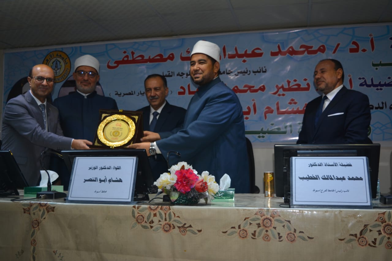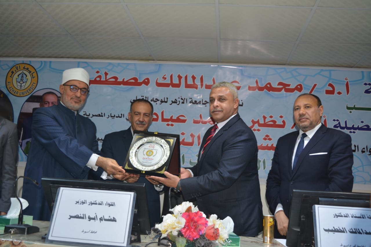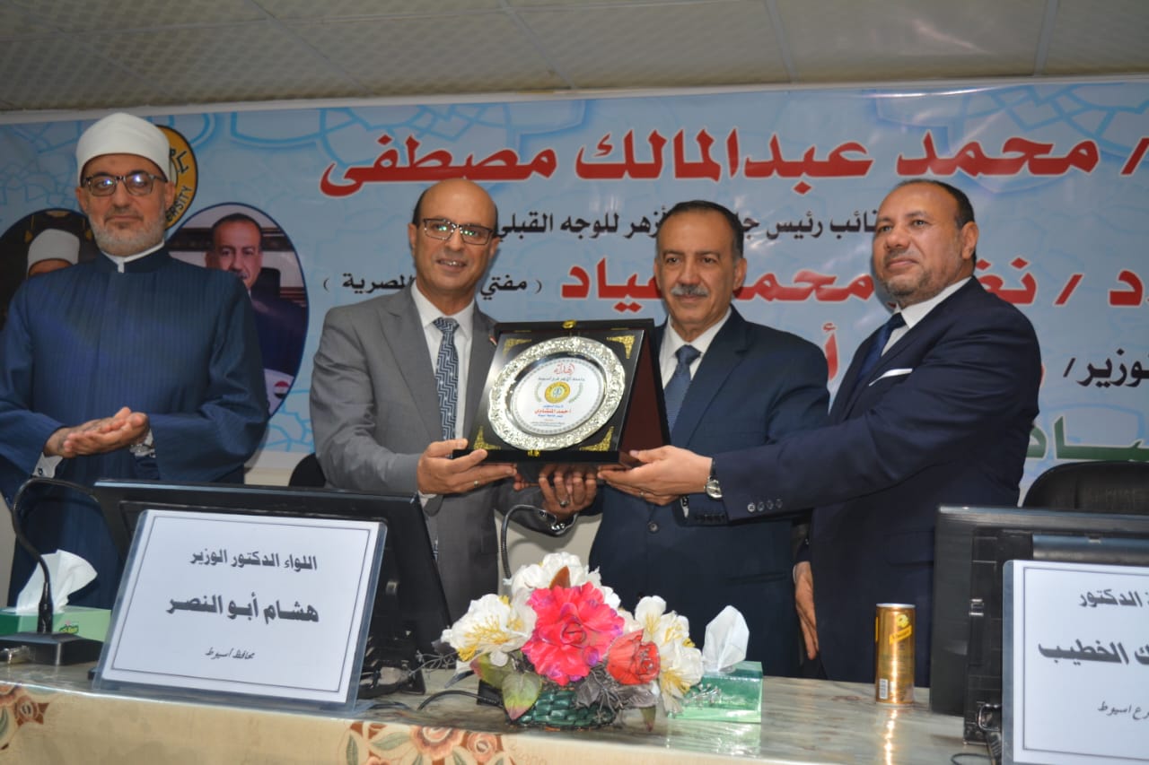 وفى الختام قدم الدكتور محمد عبد المالك نائب رئيس جامعة الأزهر للوجه القبلي الدروع التذكارية لكل من اللواء الدكتور هشام أبو النصر محافظ أسيوط والدكتور أحمد المنشاوي رئيس جامعة أسيوط والدكتور أحمد عبد المولى نائب رئيس جامعة أسيوط واللواء محمود فاروق مدير المخابرات الحربية والدكتور مينا عماد نائب محافظ أسيوط والدكتور حسن الخليل أمين عام مساعد مجمع البحوث الإسلامية.