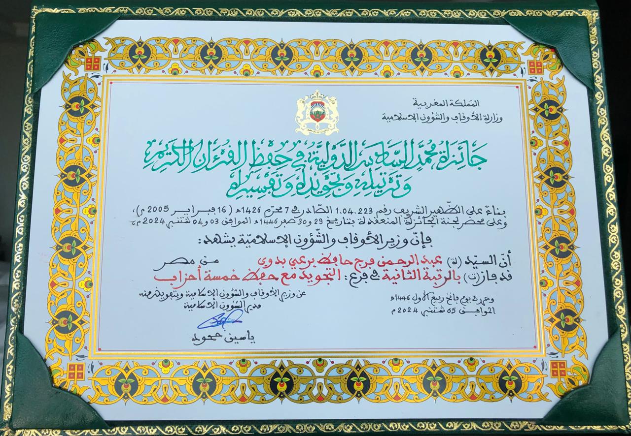 فاز المتسابق عبد الرحمن فرج حافظ برعي مرشح الأوقاف المصرية، للمشاركة في مسابقة الملك محمد السادس الدولية في حفظ القرآن الكريم وترتيله وتجويده بالمغرب بالمركز الثاني في المسابقة، في فرع التجويد مع حفظ خمسة أجزاء.