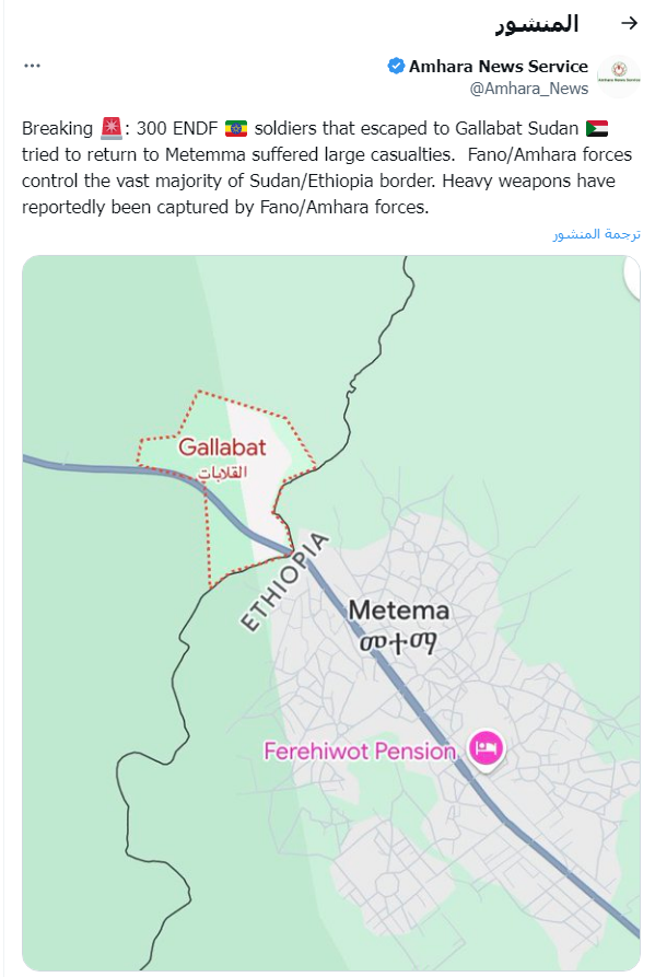 وأضاف موقع أخبار الأمهرا أن "300 جندي من قوات الدفاع الوطني الإثيوبية فروا إلى جالابات بالسودان وحاولوا العودة إلى ميتيما وتكبدوا خسائر فادحة. تسيطر قوات فانو/أمهرة على الغالبية العظمى من الحدود بين السودان وإثيوبيا. وبحسب ما ورد استولت قوات فانو/أمهرة على أسلحة ثقيلة."