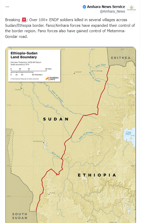 وقال موقع "أخبار الأمهرا" الرسمي عبر منصة "أكس": "مقتل أكثر من 100 جندي من قوات الدفاع الوطني الإثيوبية في عدة قرى على طول الحدود بين السودان وإثيوبيا. كما وسعت قوات فانو/أمهرة سيطرتها على منطقة الحدود. كما سيطرت قوات فانو على طريق ميتيما-جوندار."