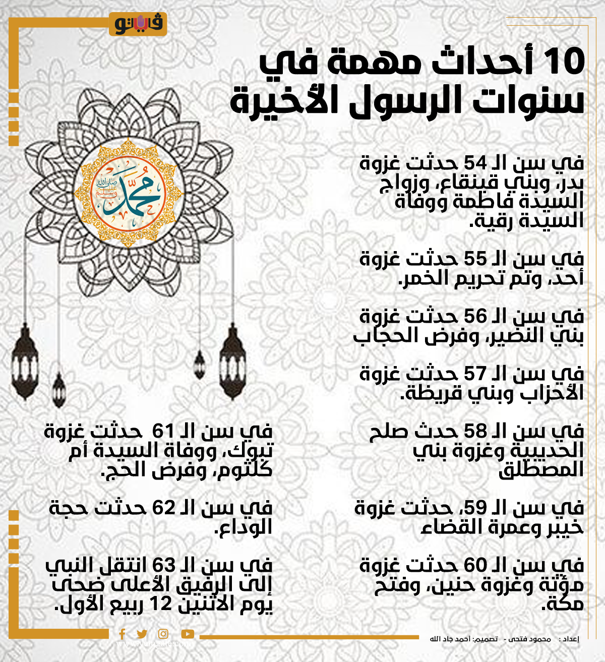 10 أحداث مهمة في سنوات الرسول الأخيرة (انفوجراف) السبت 07/سبتمبر/2024 - 10:39 م 9/7/2024 10:39:13 PM 10 أحداث مهمة في سنوات الرسول الأخيرة محمود فتحى شارك طباعة 18 حجم الخط شارك طباعة