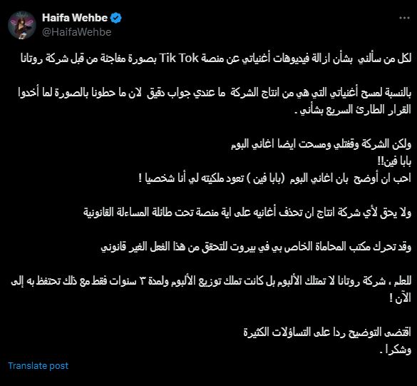 وكتبت هيفاء في منشور عبر حسابها بموقع التواصل الاجتماعي «إكس»، عن الأمر: “لكل من سألني بشأن إزالة فيديوهات أغنياتي عن منصة Tik Tok بصورة مفاجئة من قبل شركة روتانا.. بالنسبة لمسح أغنياتي التي هي من إنتاج الشركة ما عندي جواب دقيق”.
