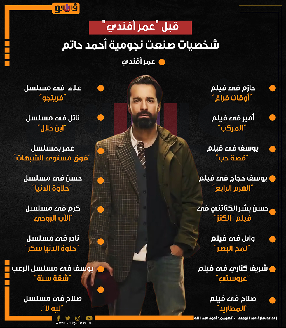 قبل "عمر أفندي"، شخصيات صنعت نجومية أحمد حاتم (إنفوجراف) الأحد 08/سبتمبر/2024 - 11:24 ص 9/8/2024 11:24:28 AM عمر أفندي، فيتو سارة عبد المجيد شارك طباعة 18 حجم الخط شارك طباعة ابن حلال أحمد حاتم الهرم الرابع الأب الروحي حلوة الدنيا سكر حلاوة الدنيا عمر أفندي عروستي شقة ستة