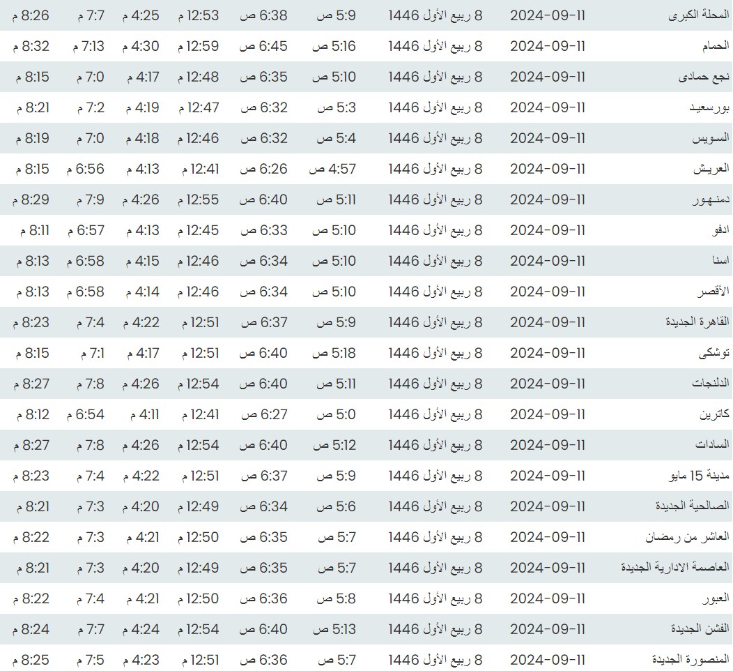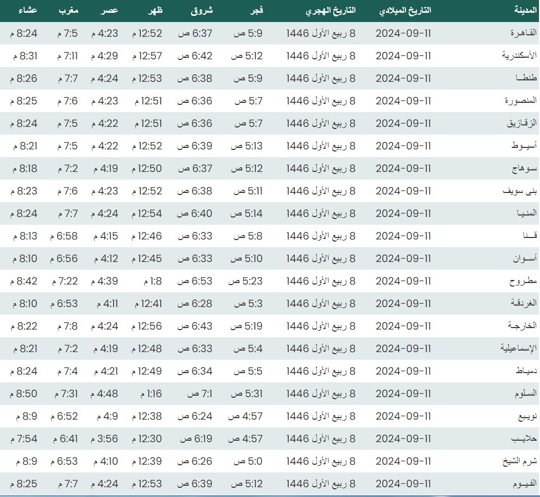 مواقيت الصلاة اليوم وفقًا للتوقيت المحلي لمدينتي القاهرة والإسكندرية وكذلك،مواقيت الصلاة، لعدد من مدن ومحافظات الجمهورية من واقع بيانات الهيئة العامة للمساحة