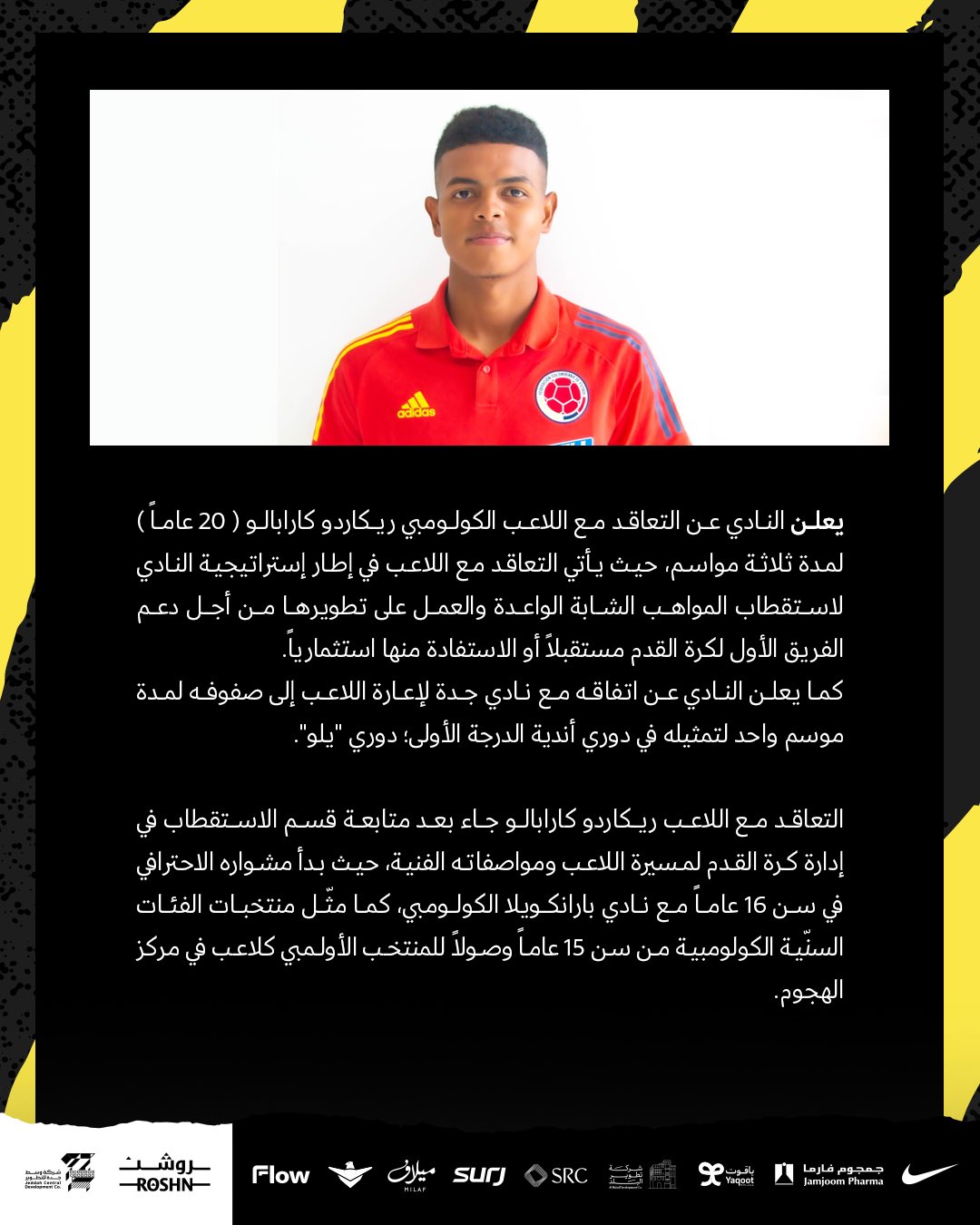 وأكد الاتحاد عبر حسابه الرسمي بمنصة "إكس" للتواصل الاجتماعي، تعاقده مع الكولومبي ريكاردو كارابالو صاحب الـ20 عاما، لكنه لن يشارك مع الفريق خلال الموسم الجاري.