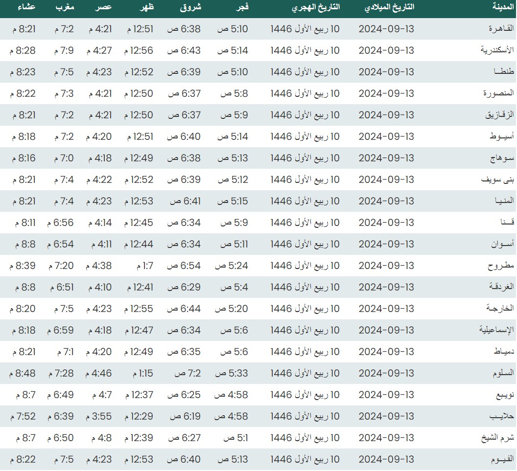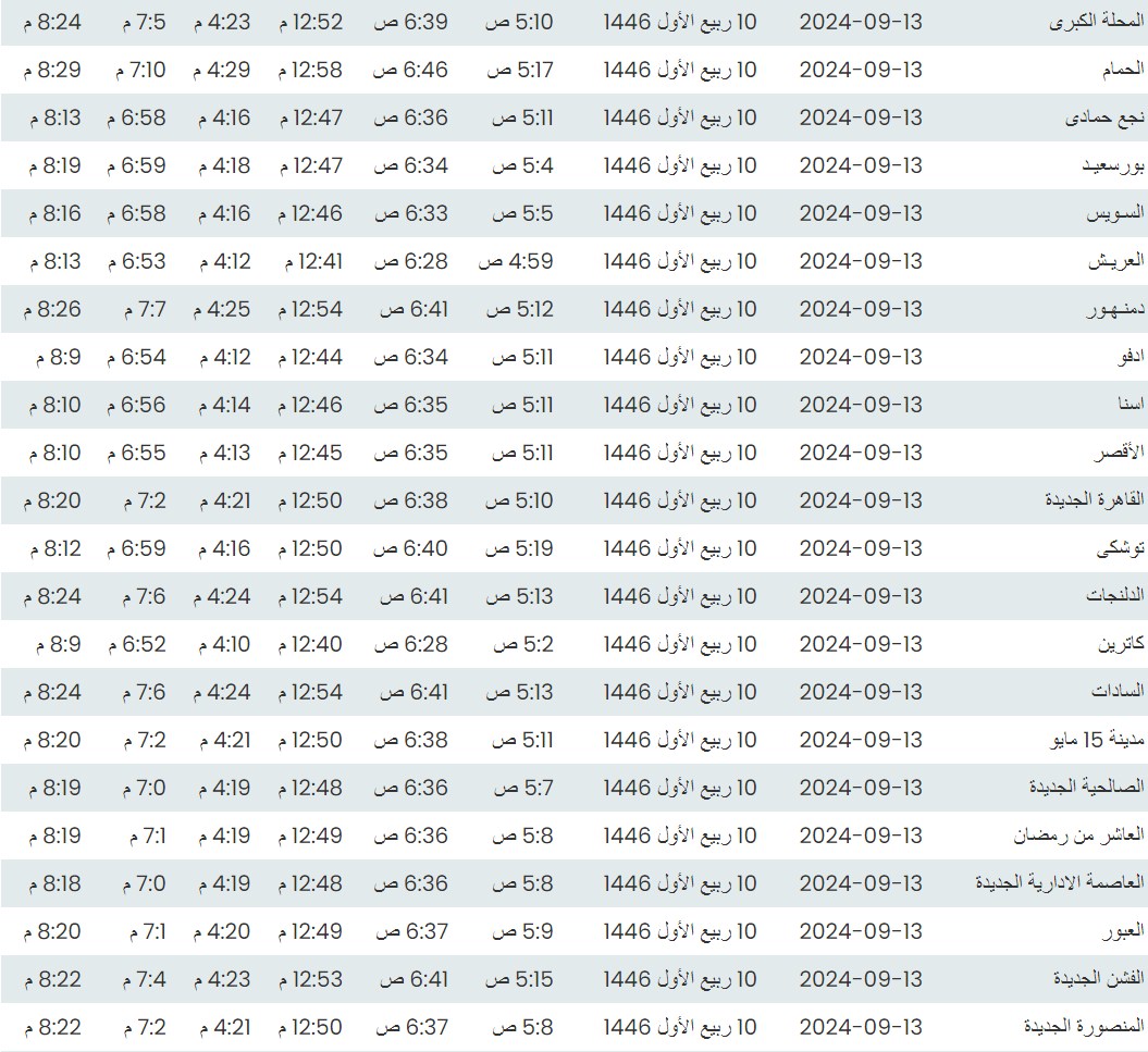 مواقيت الصلاة اليوم وفقًا للتوقيت المحلي لمدينتي القاهرة والإسكندرية وكذلك،مواقيت الصلاة، لعدد من مدن ومحافظات الجمهورية من واقع بيانات الهيئة العامة للمساحة