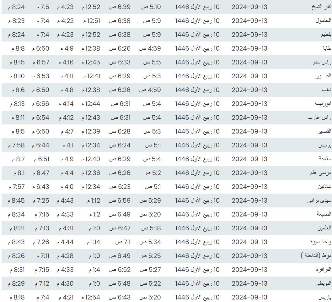 وفيما يلي مواقيت الصلاة، لعدد من مدن ومحافظات الجمهورية من واقع بيانات الهيئة العامة للمساحة