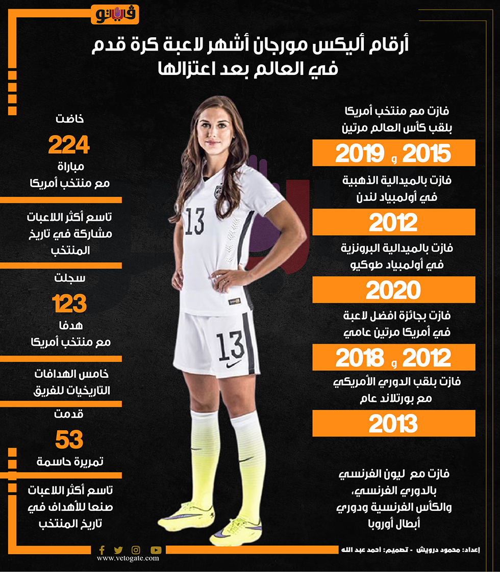 أرقام أليكس مورجان أشهر لاعبة كرة قدم في العالم بعد اعتزالها (انفوجراف) الإثنين 09/سبتمبر/2024 - 05:51 م 9/9/2024 5:51:13 PM أليكس مورجان محمود درويش شارك طباعة 18 حجم الخط شارك طباعة الأمريكية أليكس مورجان أليكس مورجان مورجان منتخب أمريكا الكرة النسائية