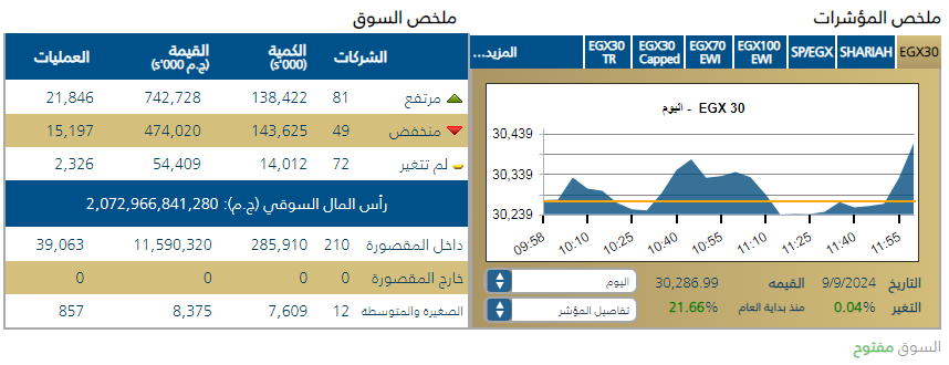 - ارتفع مؤشر "إيجي إكس 30" بنسبة 0.04 % عند مستوى 30.286.99 نقطة