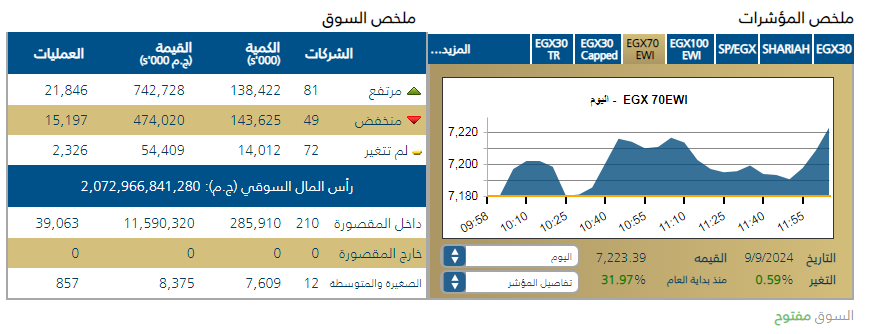 - كما ارتفع مؤشر الشركات الصغيرة والمتوسطة "إيجي إكس 70 متساوي الأوزان" بنسبة 31.97 % عند مستوى 7.223.39 نقطة.