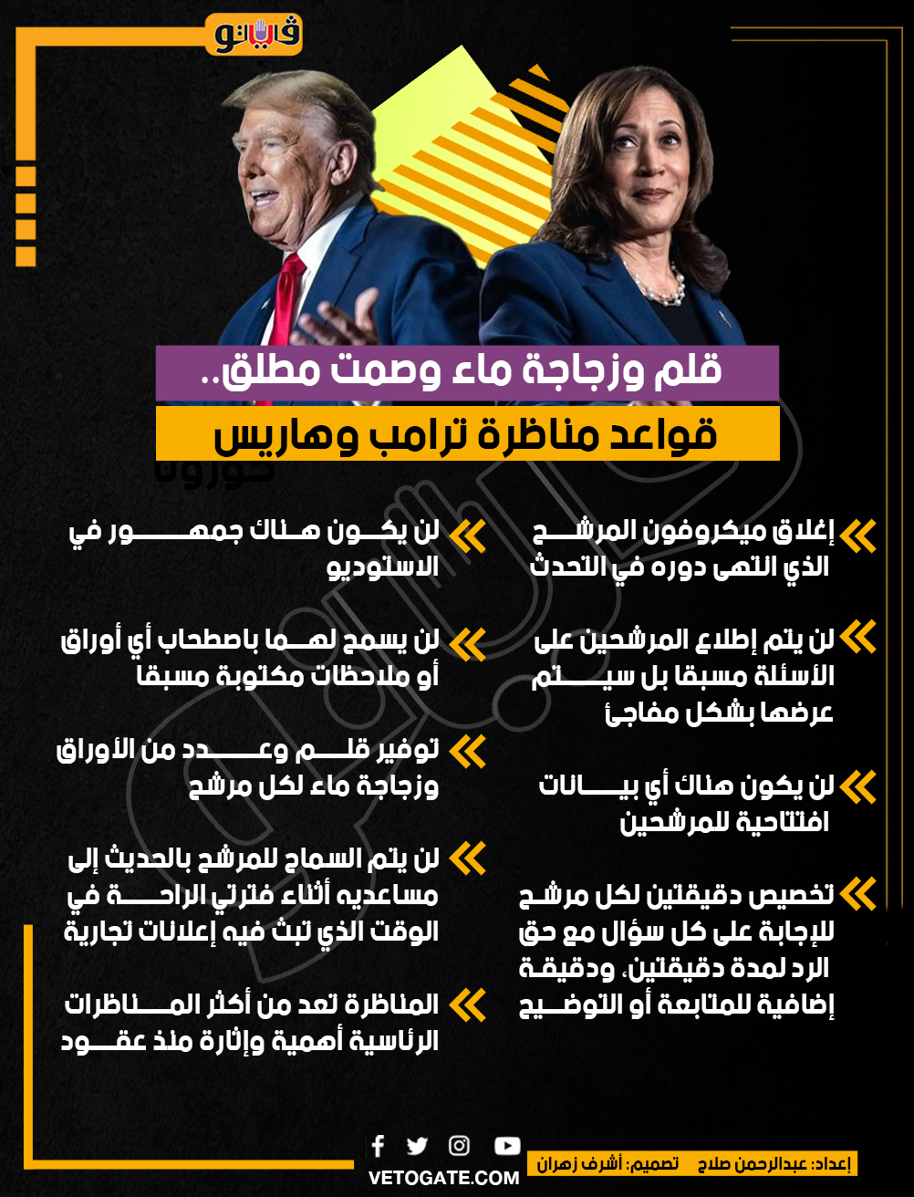 قلم وزجاجة ماء وصمت مطلق.. قواعد مناظرة ترامب وهاريس (انفوجراف) الإثنين 09/سبتمبر/2024 - 11:01 م 9/9/2024 11:01:19 PM هاريس وترامب، فيتو عبدالرحمن صلاح تنفيذ: أشرف زهران شارك طباعة 18 حجم الخط شارك طباعة ترامب هاريس ترامب وهاريس مناظرة ترامب وهاريس الانتخابات الأمريكية الانتخابات الرئاسية الأمريكية