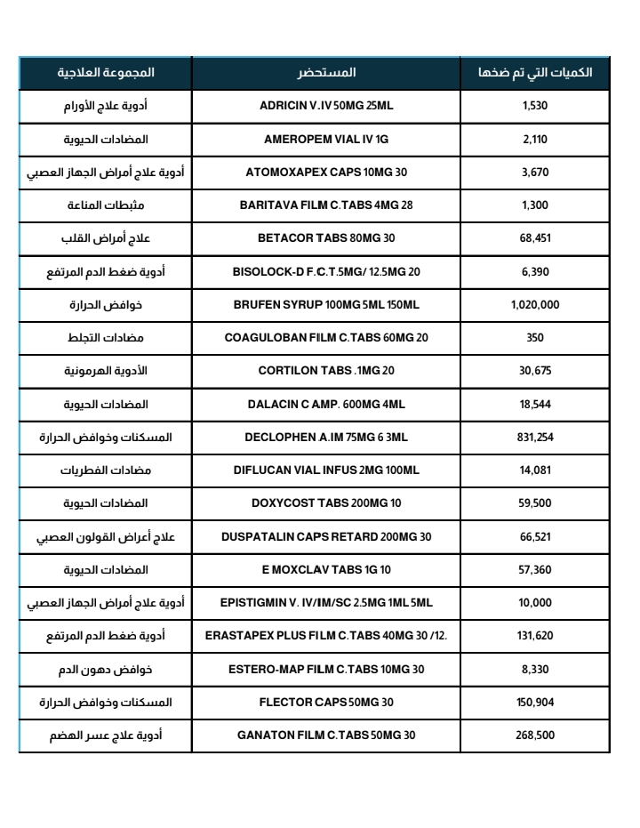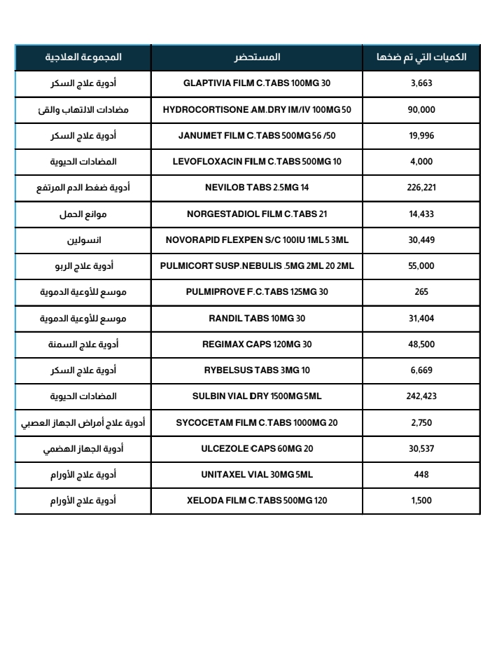 يأتي ذلك في إطار حرص الحكومة على متابعة سوق الدواء، واستمرار جهود هيئة الدواء المصرية لضمان توافر الأدوية الضرورية في السوق المحلي؛ تم ضخ كميات إضافية من العديد من المستحضرات الدوائية المهمة أبرزهم أدوية الضغط والقلب والسكر والأورام والمضادات الحيوية.